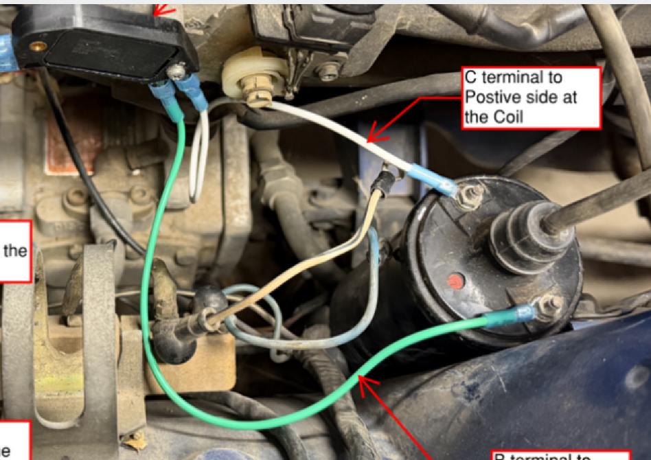 I would add some details of how, exactly, you are evaluating "spark". With a spark plug at the end of a plug wire, through the coil center terminal, with a spark tester...? Are you cranking the engine when you do this? Have you disconnected the original module by the fuse box or did you resintall it? And, or, but, I have noticed that you do not have any battery power going to the coil in your picture. You only have the coil connected to the module and no pwer to the module either. You need power to the coil positive terminal. Also, use your meter and make sure that the mounting screw of the module has a good ground. And make sure that it's the correct screw. Only one of the screws completes the ground through the module, it has a thicker ferrule. Looks like you have the correct screw but you might not have good contact through that screw head or where it seats on the TB. The TB is not the best place to mount it. That's where all of the coil current flows when the module is doing its thing. And, it you plan to run it for long you need a proper heat sink under the flat part of the module. It gets hot and heat will cause them to fail.