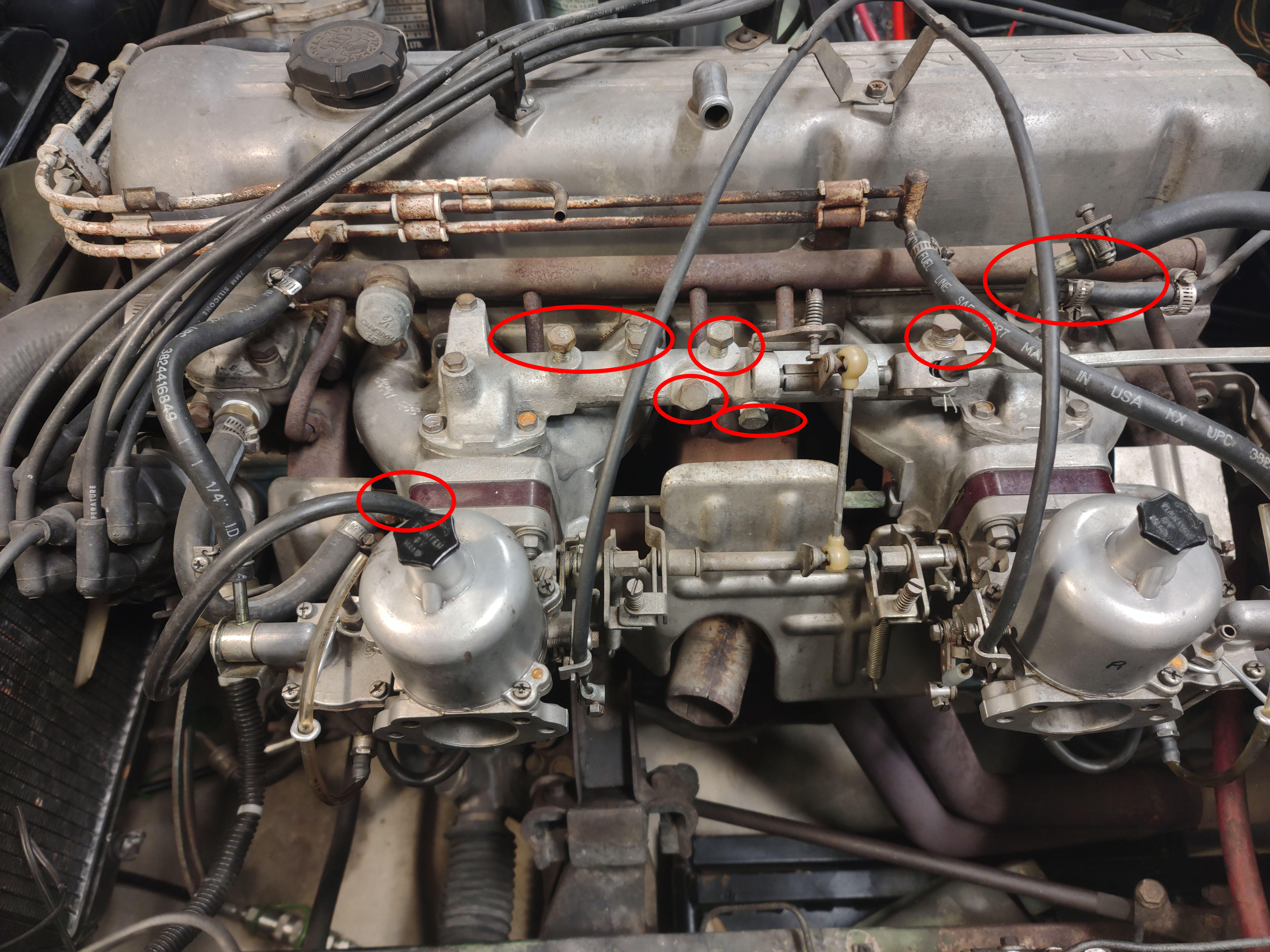 I included a photo. I circled all of the ports in the vacuum manifold, I think they call it something else. I bought the 240z assembly used on ebay, so somebody had messed with everything, I mean everything. They plugged many of the threaded ports where things, mostly emission items attached. They did not use Teflon tape, and I don't even know if the threads matched. I'm thinking about removing all the plugs, which in some cases are just bolts. If the threads are not right, correct them and use teflon tape to seal the threads. It would be easy to seal off the vacuum lines going to the master vac and transmission.