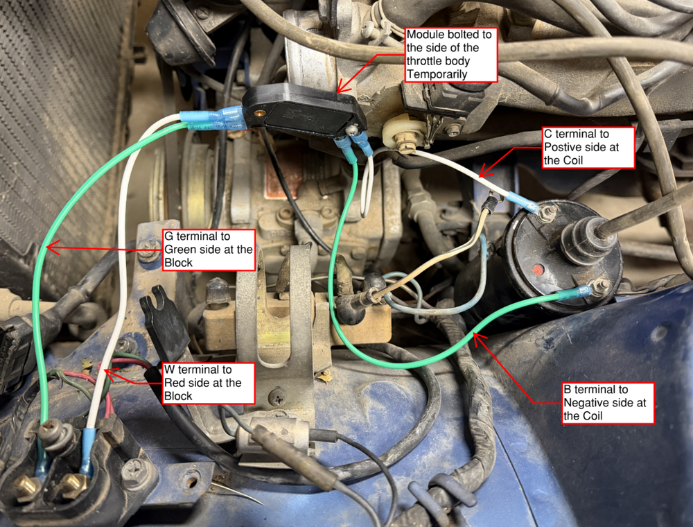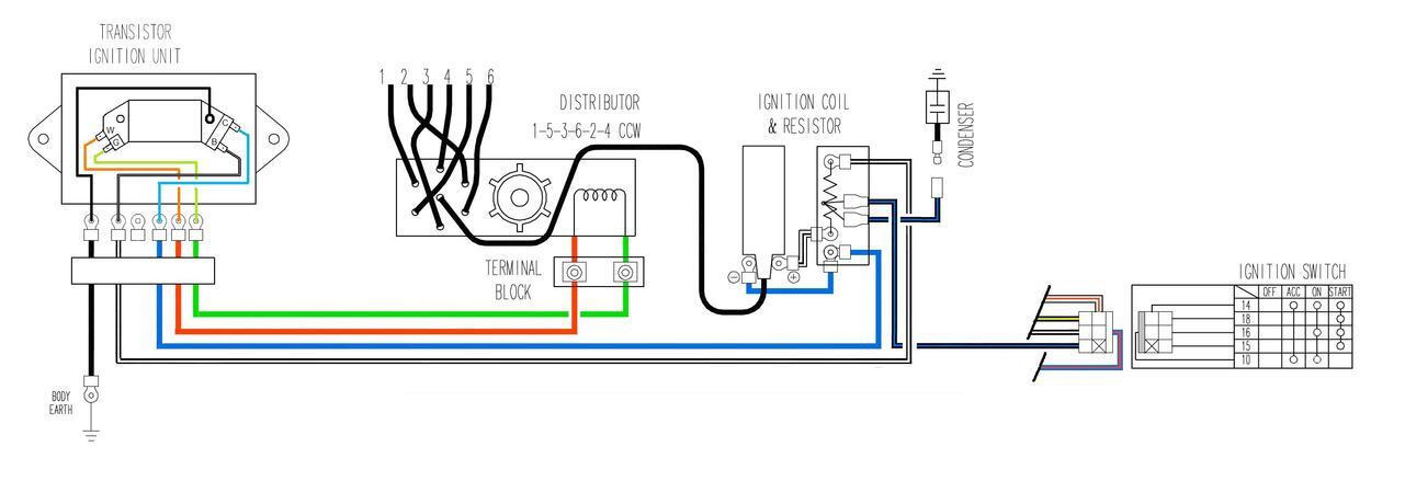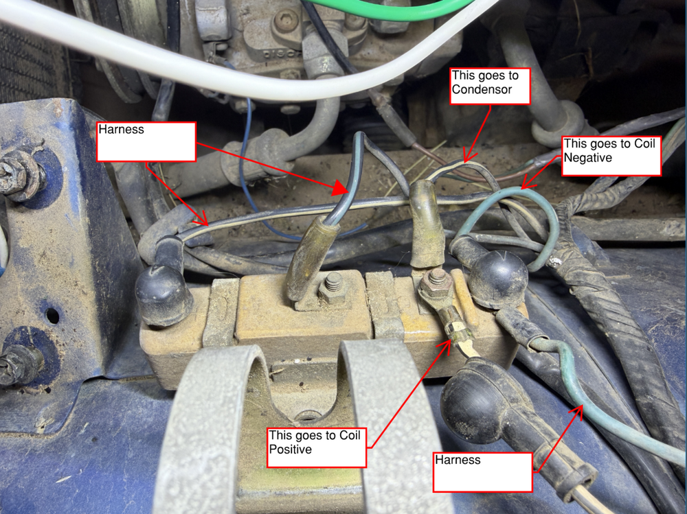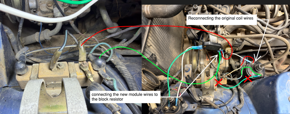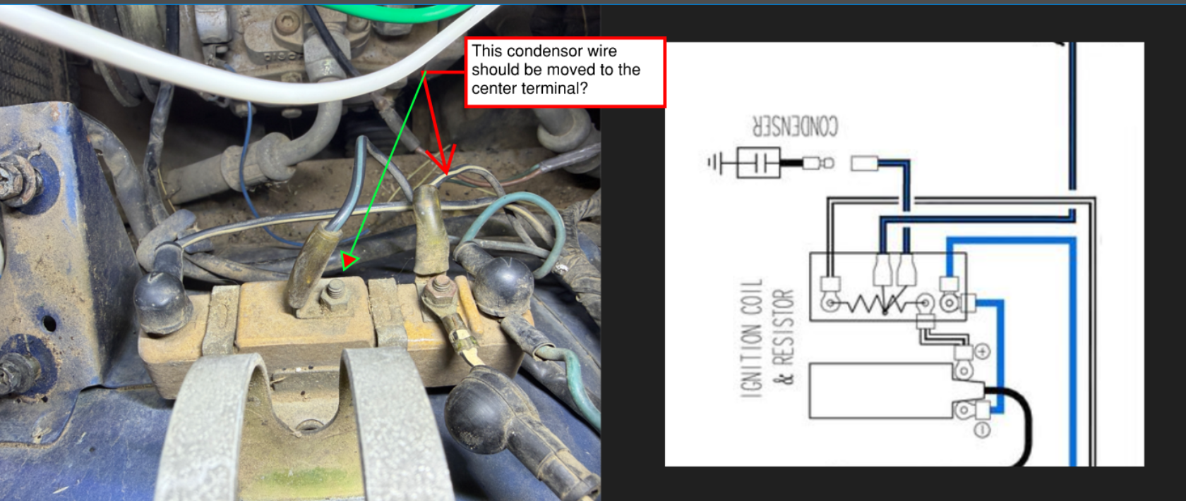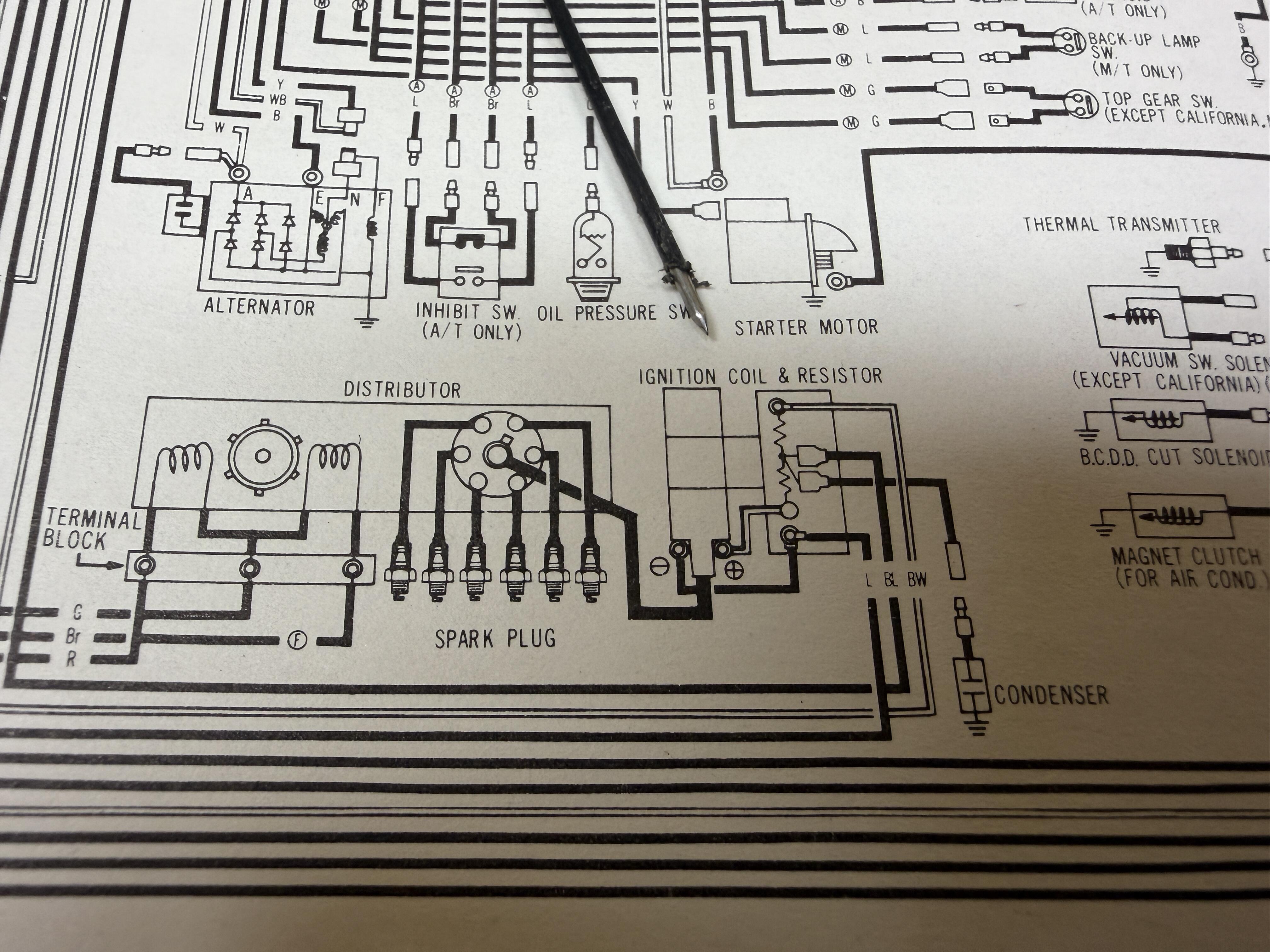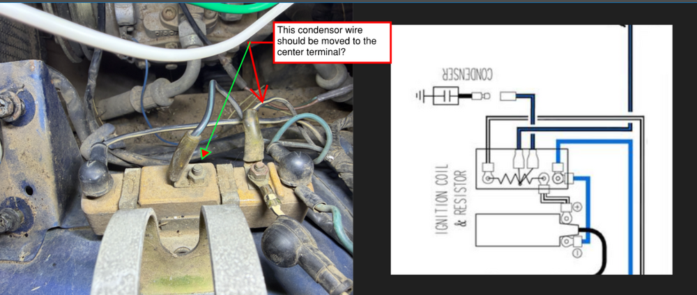 2. some new updates on my ignition woes and HEI module upgrade. Tested resistances on anything I currently have knowledge of. Near as I can tell, everything is as it should be. I tested both coils that I have using the method listed in the video below. I'm a sucker for detailed documentation and I had a hard time following some of the posts I found. So hopefully this will help others. The initial test was to test the resistance of the tester itself and it turns out mine needs a little recalibration. Not a huge deal as I understand that I just need to subtract the value from the readings that I take. It turns out that I am off by 1.6 ohms. It is a 30 year old meter though that I inherited from my dad. The readings on the new coil. 3.1 ohm (1.5ohm corrected) between the + and - terminals and 11,280 ohms between the positive and center. I purchased this (amazon) coil. It is suppose to be a stock replacement. Pretty similar readings on the old coil. I kinda figured the old was was good, but meh, why not replace it just in case. 2.2 ohm (.6 ohm corrected) between the + and - terminals and 14,450 ohms between the positive and center. Also tested resistance on the pickup coil in the distributor and it reads about 675 ohms. According to this post by Zedhead it should read around 720ohms. I feel like this reading is acceptable. I checked the voltage to the positive side of the coil with the ignition on (white w/ black stripe) as well as suggested by Fastwoman in this post. As well as the battery itself which is new but i have to get a charger on it. The voltages with the ignition on and off were practically identical. With that aside, im now looking into the wiring for the new HEI module. There are tons of articles on this, but it seemed hard for me to find the info I needed, which was wiring the module. Nearly all the posts had the basics, but there was a lot of discussion about using/not using the block resistor and/or a different coil. Couple that with the myriad of wiring diagrams I ran into. It was hard to determine what was proper. At the moment I am attempting to use a stock coil with a HEI module. Here are just a few of the discussions I looked at. GM HEI Module Install by Scanf Fitting a HEI Module in a Transistor Ignition Unit 1977 280z This was the most promising diagram I could find as listed in the second link. My confusion seems to be around what I have vs what is shown here. This diagram is also identical to what I have in the FSM One issue I have with the FSM is that the wire colors don't match. But I am also not 100% this is the original wire loom yet. or maybe Im just not smart enough to decern what the wire color short hand is. Could it be possible that my condenser is on the wrong terminal. Im hesitant to just start moving and trying different wire combinations without some confidence that what I am doing is correct with the fear of making matters worse. Below is what I tried for the ignition module wiring last week. As I am writing this post I just noticed that I have the positive and negative wires backwards. If I am not mistaken, I still should be able to get some kind of spark out of it. There is another issue I'm concerned with. See more below. So now I know that the coil wires are backwards. but my other concern is weather or not I need to run the wires through the block resistor. I feel like by writing this post and working through my explanation, I should be. Instead of wiring the new module directly to the coil as shown in the following diagram that is listed in first link. (also happens to be the same post listed in the knowledge base). I should be unmodifying the existing wiring and attaching the leads to the corresponding terminals on the block resistor as shown below. Assuming I am correct, Now the only unresolved issue is where the condenser is suppose to be. According to the FSM its suppose to be connected to the center terminal? How is my logic so far?