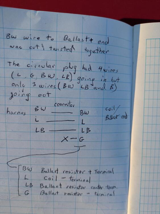 I have a correction to the wiring diagram I provided after I cleaned things up a bit and stripped off some electrical tape. The round connection has 3 wires on the harness side and 4 on the ballast/coil side. I've also found that the BW wire that attaches to the + terminal on the ballast had been cut, then twisted back together and taped. I removed the redundant ballast resistor, and soldered the wire splice so it's making better contact. I'm holding off on the suggestion to disconnect the blue wire since I'm trying to minimize the variables when I make a change. In other words, removing the second ballast resistor and improving the wire splice is enough for now. If the problem persists, I'll disconnect the blue wire. I find it odd that the connector eliminated one of the wires. Note: I have a few blank field books from work lying around that I am finding useful for keeping track of issues and updates to the Z. I wish I thought of this sooner. I also found a source of Brother shrink tube that works in a standard Brother labeler. It's great for labeling wires and holds up better than adhesive labels.