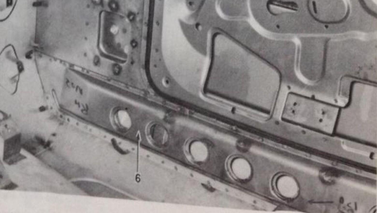 2. Refer to the figure below (taken from the FSM), which shows how the inner and outer rockers and the floor pan come together. The arrow on the outboard flange of the floor pan shows how the flange aligns with the inner rocker. Note the horizontal rib (with the 'hockey stick' shape at the forward end) that's pressed into Inner Rocker ('Inner Sill). The top of the Floor Pan's outboard flange (designated in the figure by the small black circle) should align with the lower edge of the rib. The line of spot welds that joins floor pan to inner rocker sits about halfway up the floor pan's outboard flange (see photo).