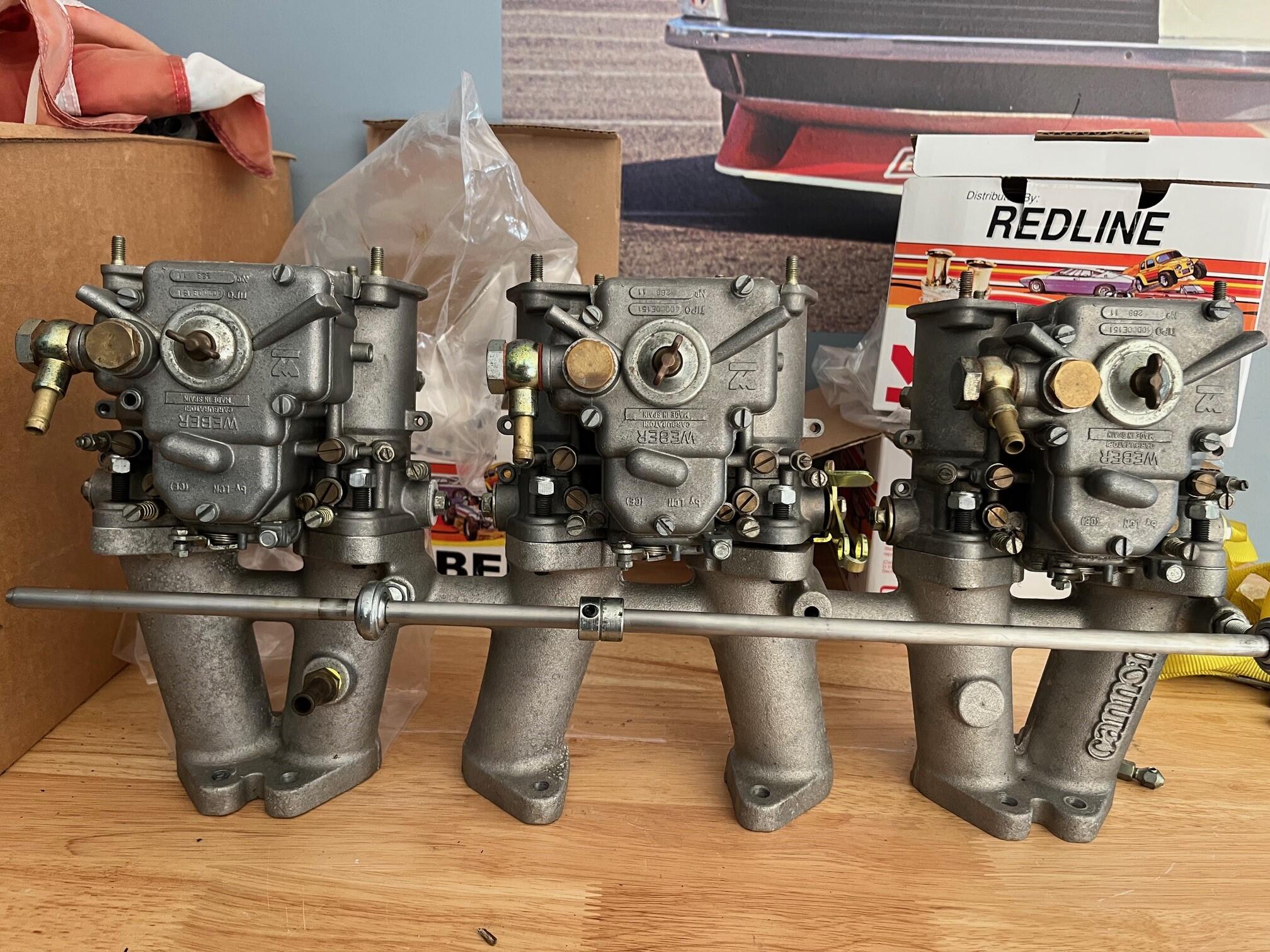 2. Cannon Manifold and three 40 DCOE 151 (spanish pedigree) weber 151s. I have had these apart and cleaned them but they still need to be gone through and verified. I had them on my Z car running since 2012. Pulled them off and need the space in my garage. Comes with oversized rod ends, and throttle arm mounting bar (less deflection), which is a modification of my own. Carbs are complete. I am pretty sure I have the air horns that came with them. I can ship to anywhere in the CONTIENTAL US, but shipping will be on the purchaser. I will box them up in a protected WEBER carb box individually. For the manifold and carbs I am asking 800 dollars plus shipping. Please give me an email at sdamico555@Gmail.com