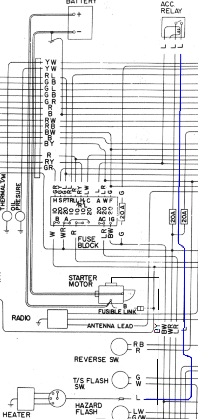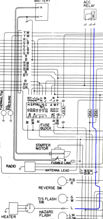 I have these two wires hanging in close proximity to the connectors that attach to the 6-lead plugs coming out of the fuse box - a thick white/red and a "normal" white (that had been covered by a black sleeve. Because of the proximity, I'm confident that the white wire connects with the white wire coming out of the left side bundle from the fuse box and services the horn circuit. I think I have a good idea of where the white/red wire goes but want confirmation from one of our electrical gurus. Because it is finished with a lug, it is supposed to be held on somewhere with a screw or bolt and I think that place is the metal block located around 3 o'clock on the MSA fuse box. On my other '72 that has the OEM fuse box, the white/red wire disappears underneath the box and I haven't torn things apart to see exactly where it attaches. Can someone verify that this white/red wire does indeed go on the screw mount inside the MSA fuse box?