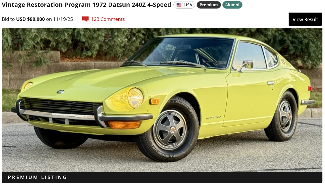 The VR Z did not reach its reserve. Didn't get to its last sale price either. https://bringatrailer.com/listing/1972-datsun-240z-380/