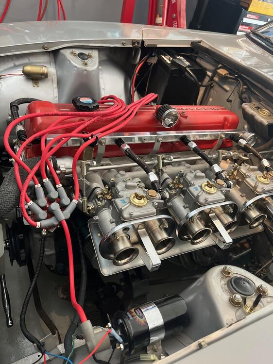 Will try to upload a movie of it running. I tried twice but its 17MB. But it is running. Carbs are still not acting right. I have dead even flow through them, all the same across 6 carbs. Same jets, but my plugs are all over the place. I installed all new floats, float pins and needle and seats in all three carbs. Getting wildly different readings on float level using the Keith Franke clear acrylic tube method. I am 22mm, 25mm, 24mm from the top, which if I recall is to high on all of them. I have 29mm from the tip as the correct setting, but I have to go research it up again. IMG_8791.MOV