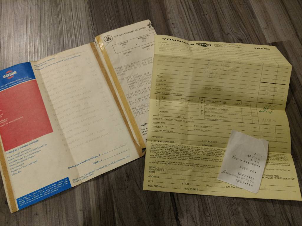 The car was originally purchased here in WA from Yonkers Datsun now "Yonkers Nissan" and has been in WA it's entire life. I have the original MSRP, Factory EPA sticker, sunroof doc's/Manuel, Original sales slip with cash receipt from PO and even the original Yonkers Datsun reg/ins visor slip with all owners manuals. It comes with a binder full of every service receipt in chronological order, yes it's that crazy! The PO actually kept fuel logs and yes I have those too.