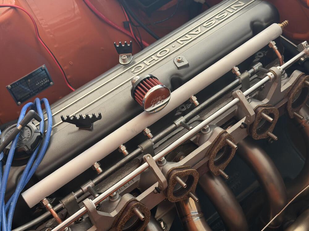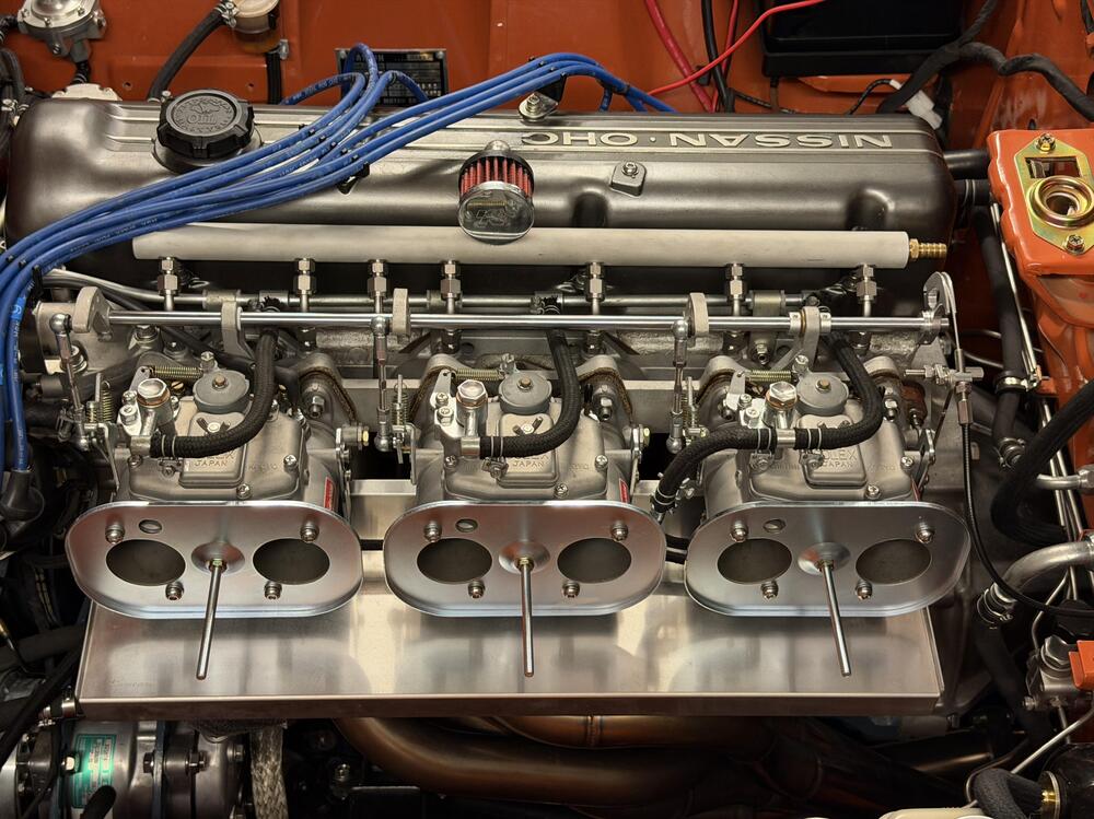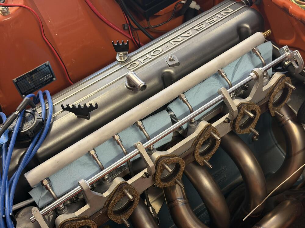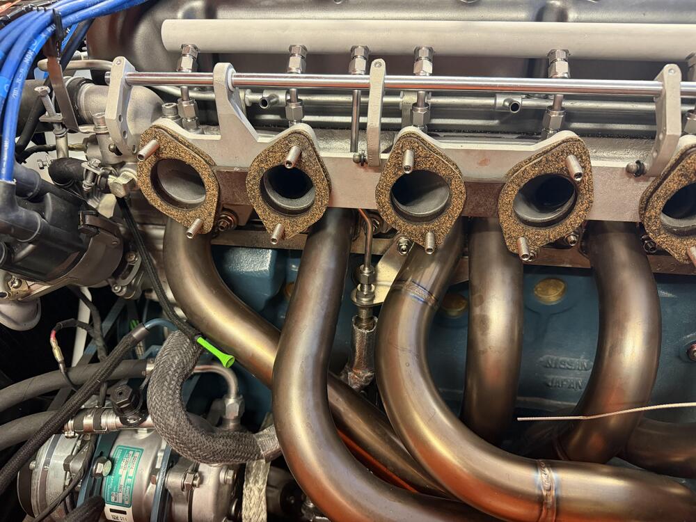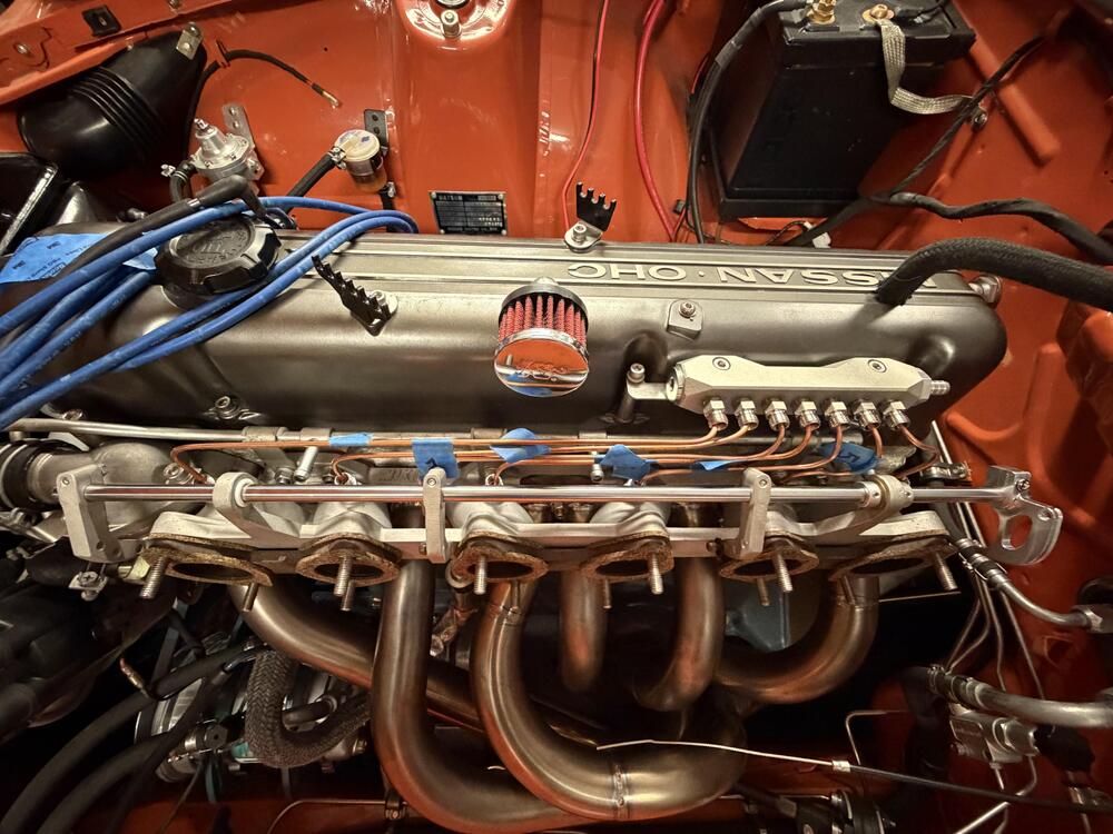 4 pointsCatch-Up Digest, Continued. After this I’m up to date. ••• March 9, 2026 They said it couldn’t be done.* If you have been following this project long enough (good job 👍🏻) you know this engine had SUs when I installed it. Lots of drama later I put triple Mikunis on it, and I’m glad I did. One thing my euro-spec SU balance tube has that my short Mikuni manifold is missing (other than clearance) is a PCV valve. Around the time I got the triples working I installed a bracket to hold one with a plan to figure out how to connect it later. Well, later is here. Several years ago I saw a Z at the east coast import show in PA sporting a custom air filter housing for a Lamborghini Countach air filter. The owners is here but I can’t find the name. We ALSO discussed its balance tube on the manifold. My plan was to do something like that, but add a port for the PCV valve. (Nismo put one with a PCV valve on the l型6気筒 TLX manifold, so please hold the snark). I would have liked to figure out a way to mount the valve right on mine, but routing the hose was getting too difficult. This cleans up the visible plumbing better. Hopefully it with function as intended. My vacuum manifold also uses the port on the #6 runner meant for the brake booster, so I move that fitting for to the back end, as well. Eight ports in all. It’s made from a 22.5 inch piece of aluminum pipe (1” OD, 0.25” wall for tapping, which is technically not enough but works). A buddy of mine was MVP on this for welding up the ends, getting my specs into his CNC machine to bore all the holes, and letting me use his lathe and mill to start the guide taps. A quick media blasting with aluminum oxide and it was pretty simple to install. The hardest part was getting 1/4” stainless tubes bent to the right angles to accommodate the irregular angles of the six manifold ports, which are so irregular they must have been drilled and tapped by hand. Lest I create the impression this was a complete breeze, know I finished a prototype meant to be final using a vacuum manifold, but bailed on it after the tubes started to look like a mess of spaghetti. Pro tip: if you’re doing something like this, get some copper tubing at a hardware store and mock it up with that before you start bending stainless. I’m pretty happy with this. The only thing I would change is to use thinner walled stainless capillary tubing. This stuff is unnecessarily robust, so it’s hard to bend and a smaller inner diameter than it could have been. *I don’t know how the balance tube will change how the engine runs. The assumption is slightly smoother, with the brake vacuum building faster at 6 times the frequency. ••• March 11, 2026 Nearly done in here. I picked up these Kameari stainless air filters on a whim from JDM Car Parts a while ago, and I’m glad I did. They look really nice paired with the heat shield (also from Kameari). I was nervous the shield wouldn’t fit with the cooling blocks installed, and it is tight, but it isn’t touching them or the header so I think I’m good there. The braided cooling block lines look nice over that shiny stainless steel. I’m still debating whether to get some short velocity stacks that will fit inside these filters. I do have a plenum for a cold air intake, and I think the old stacks are short enough to work in that, but I think it’s going to be a while before I get to that. Everything is back where it belongs now, except for the throttle cable and the booster hose. I remade the cable bracket out of thicker gauge stainless to get rid of the flexing problem with the previous version. As such I need to make some adjustments to the cam (and replace the barrel nut I lost). The hoses I need to reroute and trim to connect to the vacuum manifold I just installed. Otherwise I just have the windshield wipers and water tank to put in here and I’ll be pretty much done inside the engine bay.4 points