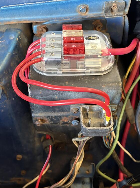 2 pointsI suggest using a marine type maxi fuse holder. Littelfuse makes a line that I believe would work well. It's the Maxi 152 series. https://www.littelfuse.com/products/fuses-overcurrent-protection/fuse-holders-fuse-blocks-accessories/fuse-holders/in-line-fuse-holders/maxi-152 I am thinking it would be a part number like 01520005Z. I attached the cutsheet from Littelfuse. Littelfuse-MAXI-152-Series-Datasheet.pdf To crimp the terminals properly, you would need a set of crimpers like this: https://www.amazon.com/dp/B0978S514B Are you sure the voltage regulator has been jumpered out? You can verify with a multimeter. Measure voltage to ground on the yellow wire at the T plug on the back of the alternator. If it has voltage, the regulator has been jumpered out. However, if that's the case, it would cause problems when the car is running, like human sacrifice, dogs and cats living together... MASS HYSTERIA! Okay, maybe not that bad, but you get the picture.2 points