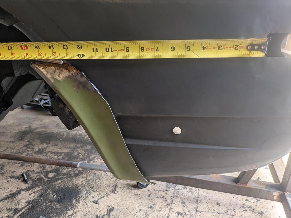 Can anyone take a measurement from the side light hole to the lip of the wheel well? I'm trying to weld on the bottom of the wheel well and need to know the standard measurement. This was cut off before I got the car unfortunately.